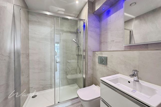 The main bathroom is stylishly finished and includes a large shower, WC and vanity sink, complemented by crisp white metro tiling and a back-lit mirror above the basin for a clean, contemporary feel.