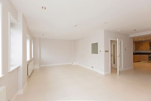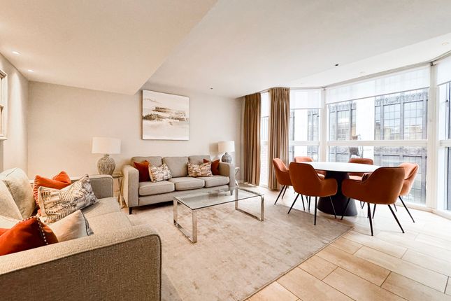 The apartment boasts a spacious and bright reception room that flows seamlessly into a contemporary modern fitted kitchen, featuring high-end, fully integrated appliances set against sleek stone worktops.