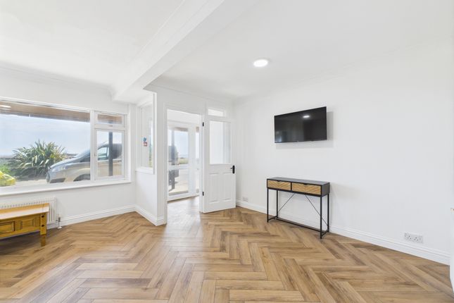The open-plan kitchen and reception room is a true highlight-bright, welcoming, and finished with wood flooring, feature cornicing, and double balcony doors that open onto a wrap-around Regency canopy balcony, offering direct views across the garden to the beach. The modern kitchen is fitted with sleek cabinetry, integrated appliances, and a sociable breakfast bar, perfect for both everyday living and entertaining.