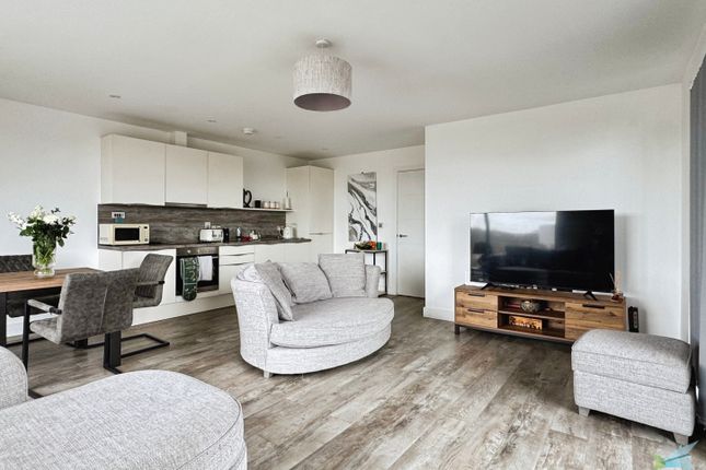 The apartment is accessed via a spacious entrance hallway, leading through to a generous open-plan living and kitchen area positioned at the rear of the property. This bright and welcoming space is flooded with natural light and enjoys uninterrupted sea views, extending across the Leas Lift development and out to the English Channel. Sliding doors open onto a private balcony, providing the perfect spot to relax and take in the coastal scenery.