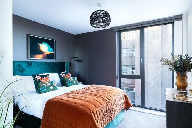 The open-plan living, dining and kitchen area is modern and inviting. The sleek kitchen is fully fitted with integrated appliances, complemented by a dedicated dining space. Full-height glazed doors flood the space with natural light and open directly onto the balcony.