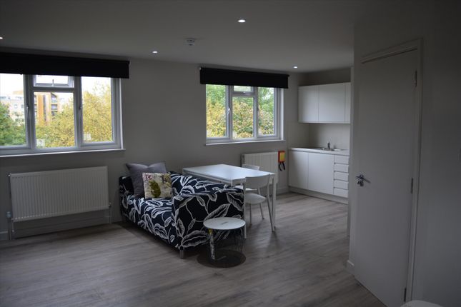 Rarely available an exceptionally well presented spacious 1st floor studio flat with lounge/bedroom/fitted kitchen area, separate modern shower room/WC, wood flooring, double glazed, communal decking area and very close to tube station, local shops. Furnished, rent includes water rates. Must be seen.