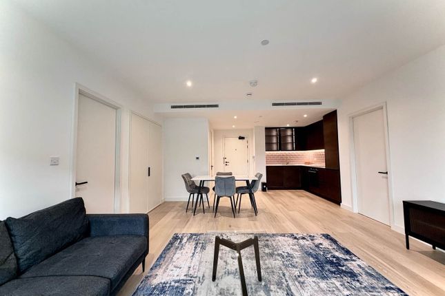Featuring floor-ceiling glazing, wood flooring, integrated modern kitchen and plenty of storage space, the apartment comprises an open plan kitchen/ living room extending onto a large private balcony, master ensuite, a further double bedroom and a family bathroom suite.