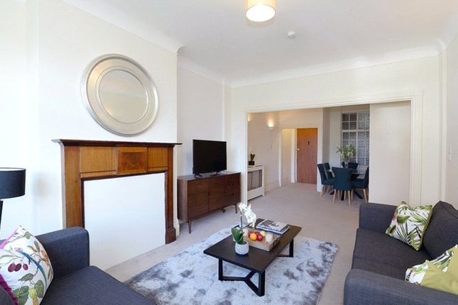 A charming eat‐in kitchen sits at the centre of the apartment and is presented with classic cabinetry, stone worksurfaces, and attractive wooden flooring. The layout allows for relaxed day‐to‐day use alongside the more formal entertaining spaces at the front of the home. A wide and elegant hallway links each room, reinforcing the lateral flow for which these buildings are so highly regarded.