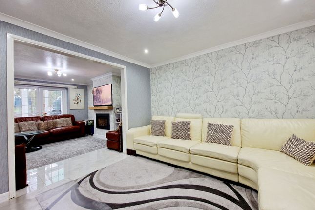 The property also benefits from a separate dining area which sits adjacent to the kitchen, providing an ideal space for dining and entertaining. The modern fitted kitchen features extensive worktop space, fitted cabinets, and a central island with breakfast bar seating. Integrated appliances are visible including oven, hob, fridge freezer, and washing facilities.