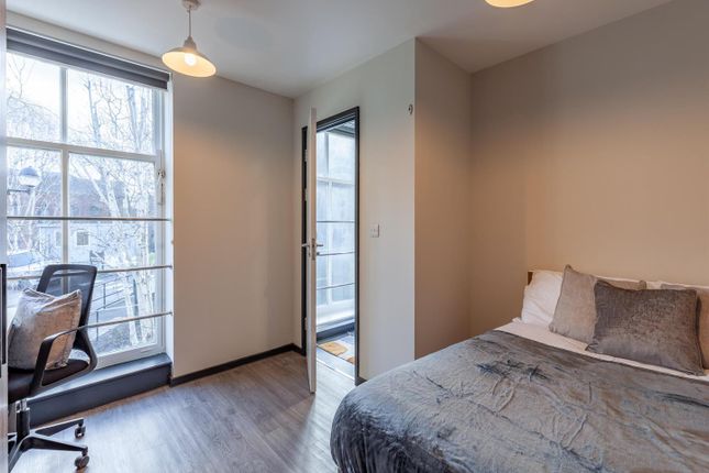 The room contains full furnishings including a double bed and wardrobe storage. The property contains a separate kitchen and bathroom, both shared with two other rooms.