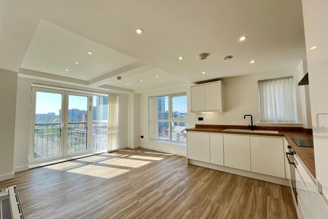 The apartment comprises a long entrance hallway with ample storage leading into a large and bright open plan living room/dining area with access to a private balcony offering city views and a modern grey kitchen with integrated appliances. Also off the hallway are two carpeted double bedrooms and stylish bathroom with bath and shower.