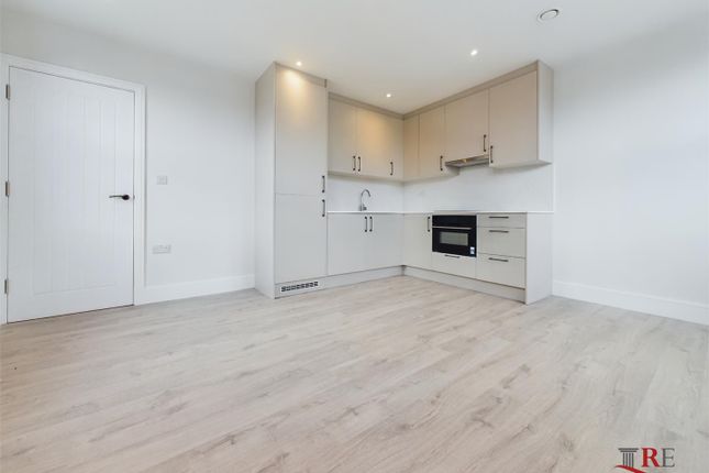 The apartment features a remarkably spacious reception room, immediately notable for its dramatic vaulted ceilings and large windows that allow for excellent natural light throughout. The room is partially furnished with sofas and offers ample space for both a lounge and a dining area. The separate fitted kitchen is well-equipped with a gas hob and oven, fridge-freezer, and washing machine, and includes additional space for a dining table, a practical, functional space for everyday living.
