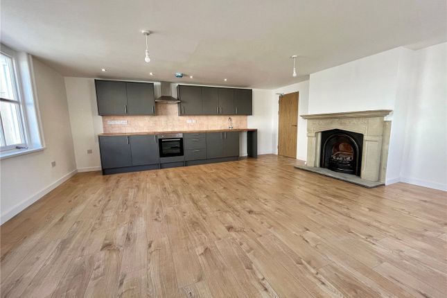 The apartment boasts a bright open-plan kitchen and living area, fully equipped with modern appliances, creating a comfortable and contemporary living space. Large windows flood the apartment with natural light and offer lively views across the town centre.